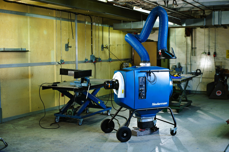 The unit has an advanced filter control system indicating the pressure drop with a series of LED's as well as on the LCD display. When the air flow is too low an audial alarm precedes the automatic, motorized compressed air cleaning sequence. An integrated silencer reduces noise from the fan and outlet air. Additional protection from harmful particles is provided if a HEPA filter is installed (optional). FilterBox 10A is available as a mobile unit on wheels or a fixed mount unit.