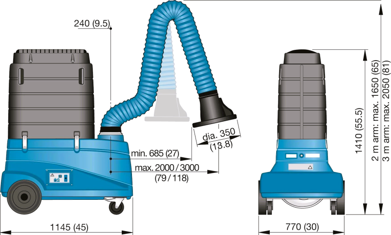 | Material | Housing in roto moulded plastic. Extraction arm in PVC hose and aluminium frame. Fan in steel and aluminium. |